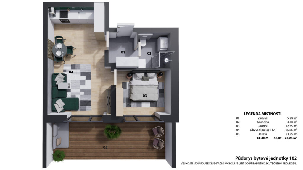 | 102 | 48 | 46,89 | 2+kk | 23,25 | terasa | ano | otevřit | prohlédnout | 4 390 000 Kč | rezervováno |