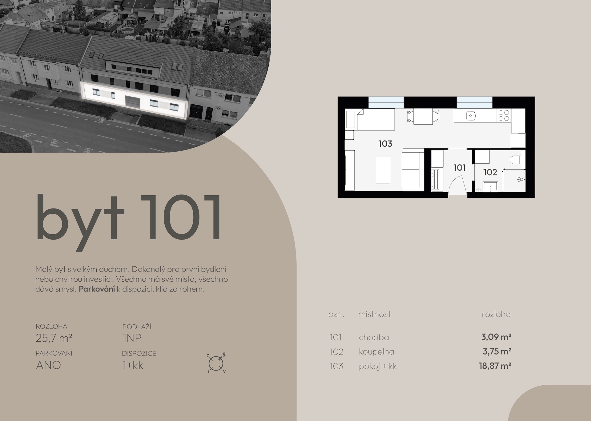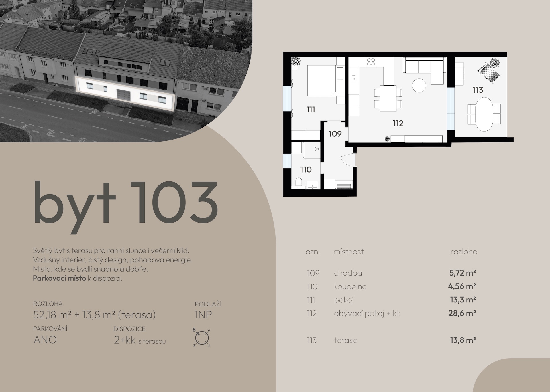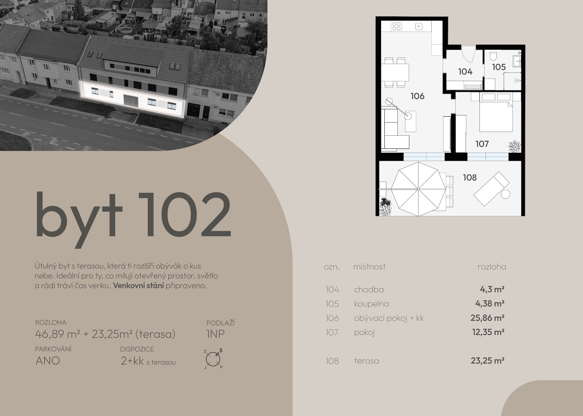 | 102 | 48 | 46,89 | 2+kk | 23,25 | terasa | ano | otevřit | prohlédnout | 4 390 000 Kč | rezervováno |