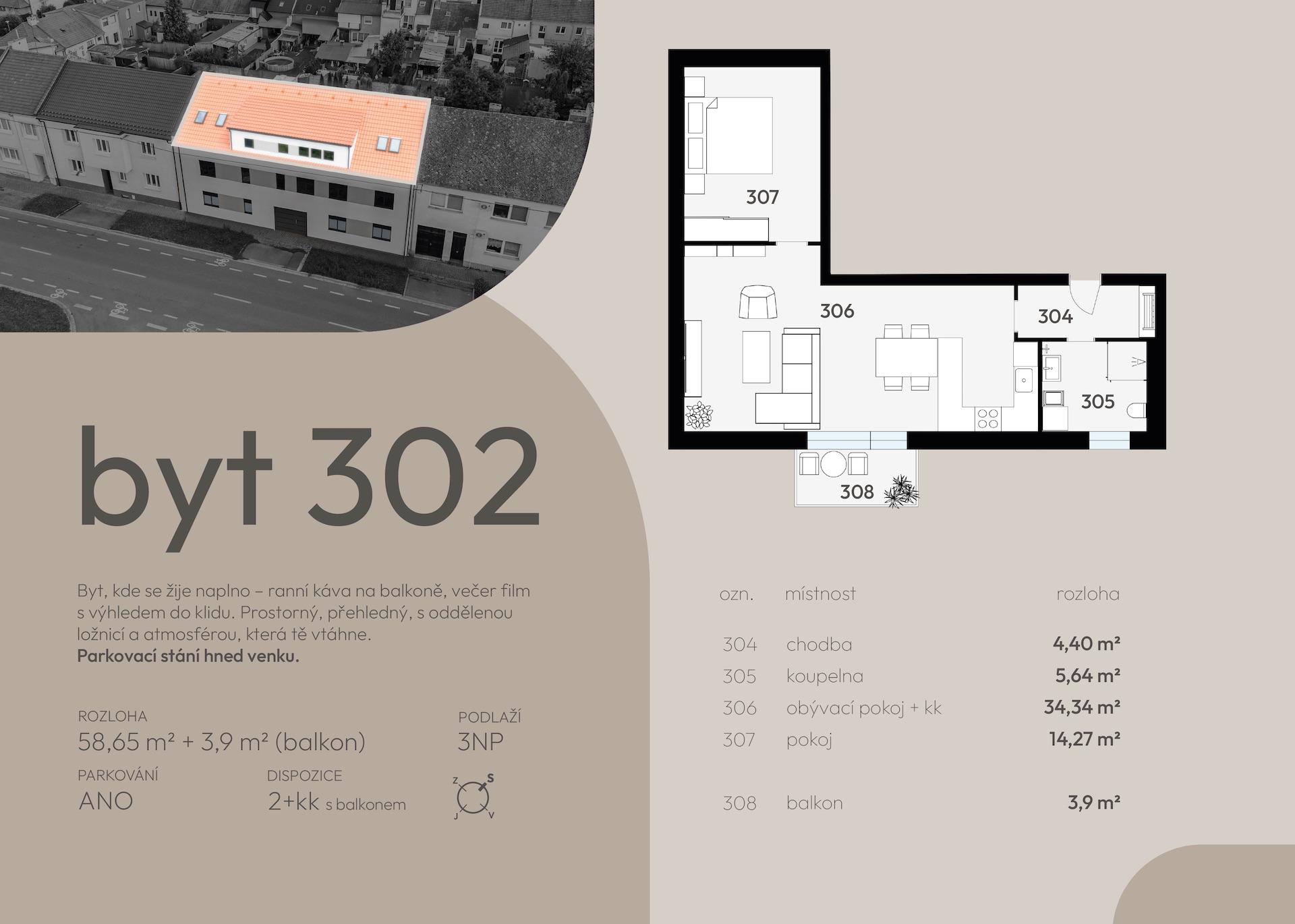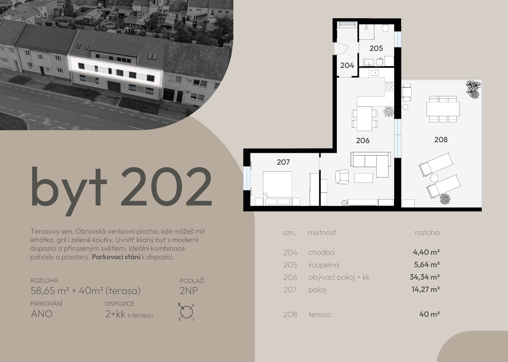 | 202 | 59,9 | 58,65 | 2+kk | 40 | terasa | ano | otevřit | prohlédnout | 5 390 000 Kč | volné |