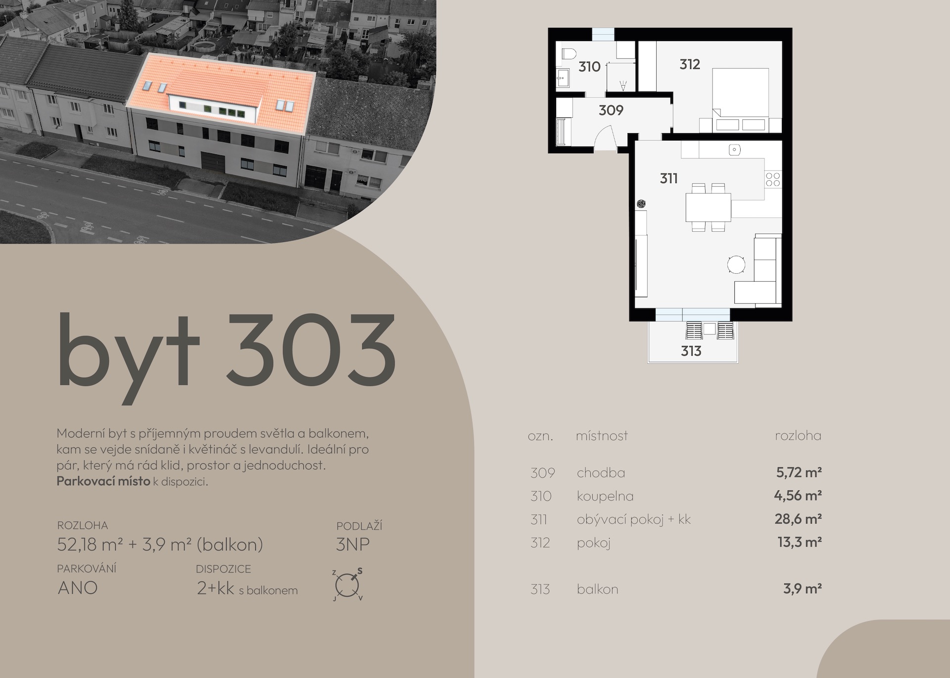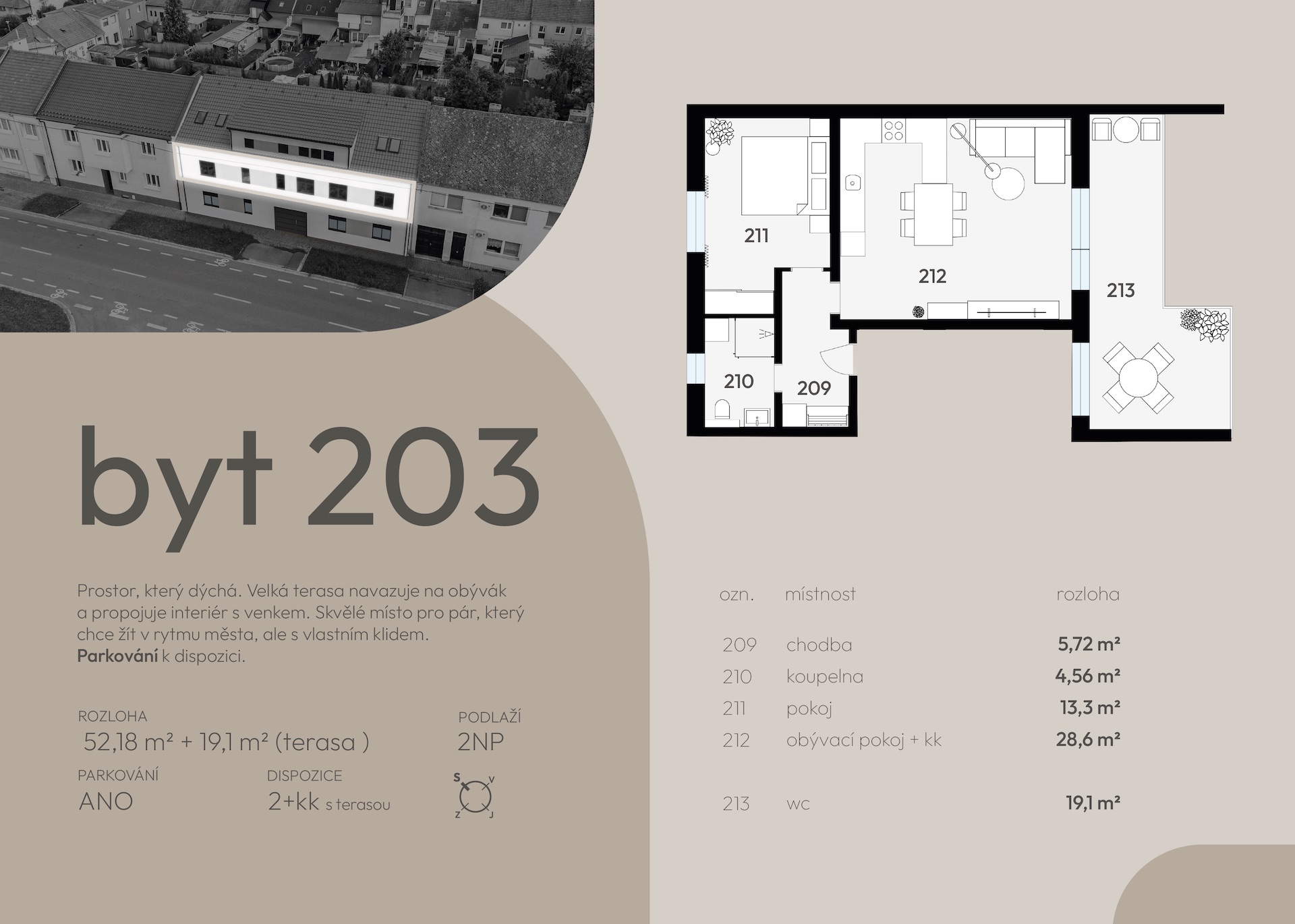 | 203 | 54 | 52,18 | 2+kk | 19,1 | terasa | ano | otevřit | prohlédnout | 4 590 000 Kč | volné |